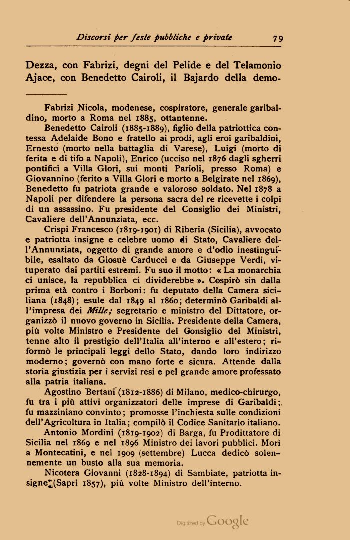Crispi Francesco (1819-1901) di Riberia (Sicilia), avvocato e patriotta insigne e celebre uomo «li Stato, Cavaliere dell'Annunziata, oggetto di grande amore e d'odio inestinguibile, esaltato da Giosuè Carducci e da Giuseppe Verdi, vituperato dai partiti estremi. Fu suo il motto: « La monarchia ci unisce, la repubblica ci dividerebbe ». Cospirò sin dalla prima età contro i Borboni: fu deputato della Camera siciliana (1848); esule dal 1849 al 1860; determinò Garibaldi all'impresa dei Mille ; segretario e ministro del Dittatore, organizzò il nuovo governo in Sicilia. Presidente della Camera, più volte Ministro e Presidente del Consiglio dei Ministri, tenne alto il prestigio dell'Italia all'interno e all'estero; riformò le principali leggi dello Stato, dando loro indirizzo moderno ; governò con mano forte e sicura. Attende dalla storia giustizia per i servizi resi e pel grande amore professato alla patria italiana.