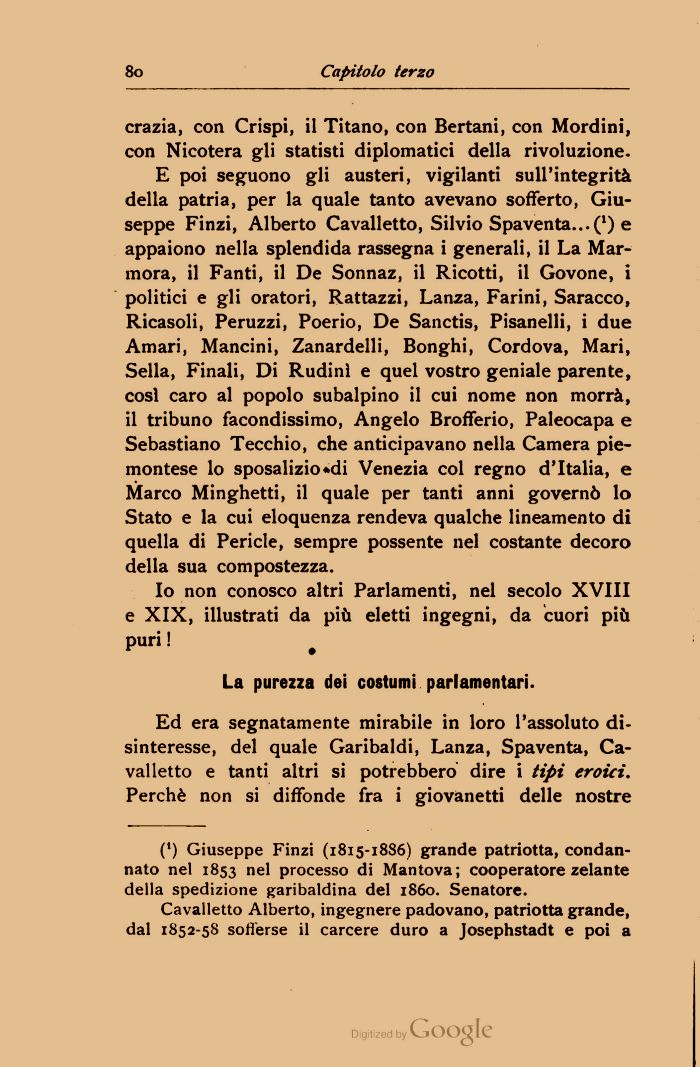 E poi seguono gli austeri, vigilanti sull'integrità della patria, per la quale tanto avevano sofferto, Giuseppe Finzi, Alberto Cavalletto, Silvio Spaventa...(') e appaiono nella splendida rassegna i generali, il La Mar-mora, il Fanti, il De Sonnaz, il Ricotti, il Govone, i politici e gli oratori, Rattazzi, Lanza, Farini, Saracco, Ricasoli, Peruzzi, Poerio, De Sanctis, Pisanelli, i due Amari, Mancini, Zanardelli, Bonghi, Cordova, Mari, Sella, Finali, Di Rudinì e quel vostro geniale parente, cosi caro al popolo subalpino il cui nome non morrà, il tribuno facondissimo, Angelo Brofferio, Paleocapa e Sebastiano Tecchio, che anticipavano nella Camera piemontese lo sposalizio*di Venezia col regno d'Italia, e Marco Minghetti, il quale per tanti anni governò lo Stato e la cui eloquenza rendeva qualche lineamento di quella di Pericle, sempre possente nel costante decoro della sua compostezza.