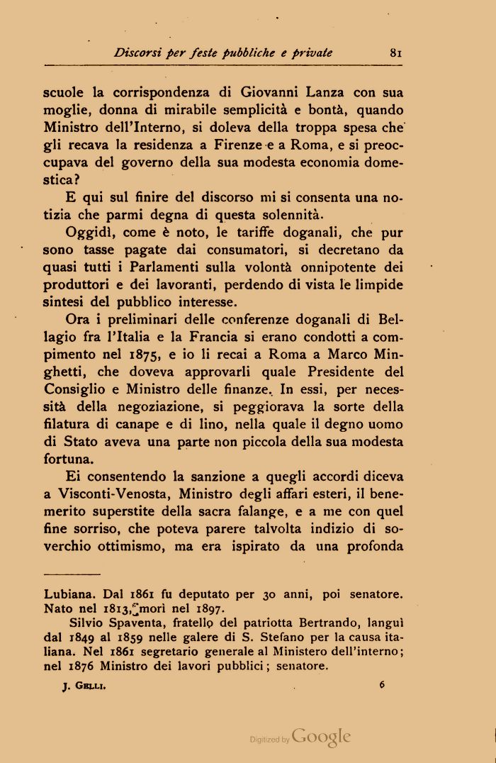 Ora i preliminari delle conferenze doganali di Bel-lagio fra l'Italia e la Francia si erano condotti a compimento nel 1875, e io li recai a Roma a Marco Min-ghetti, che doveva approvarli quale Presidente del Consiglio e Ministro delle finanze. In essi, per necessità della negoziazione, si peggiorava la sorte della filatura di canape e di lino, nella quale il degno uomo di Stato aveva una parte non piccola della sua modesta fortuna.