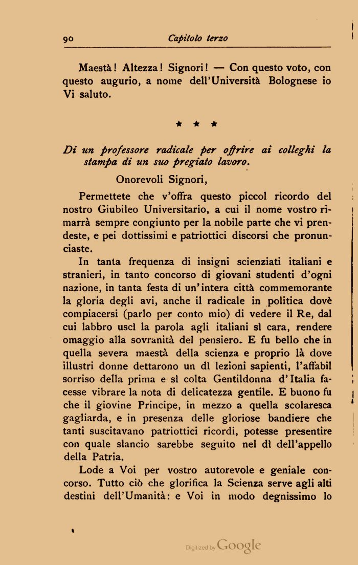 Permettete che v'offra questo piccol ricordo del nostro Giubileo Universitario, a cui il nome vostro rimarrà sempre congiunto per la nobile parte che vi prendeste, e pei dottissimi e patriottici discorsi che pronunciaste.