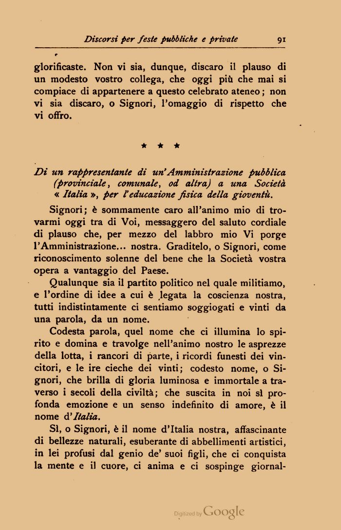 Signori; è sommamente caro all'animo mio di trovarmi oggi tra di Voi, messaggero del saluto cordiale di plauso che, per mezzo del labbro mio Vi porge l'Amministrazione... nostra. Graditelo, o Signori, come riconoscimento solenne del bene che la Società vostra opera a vantaggio del Paese.
