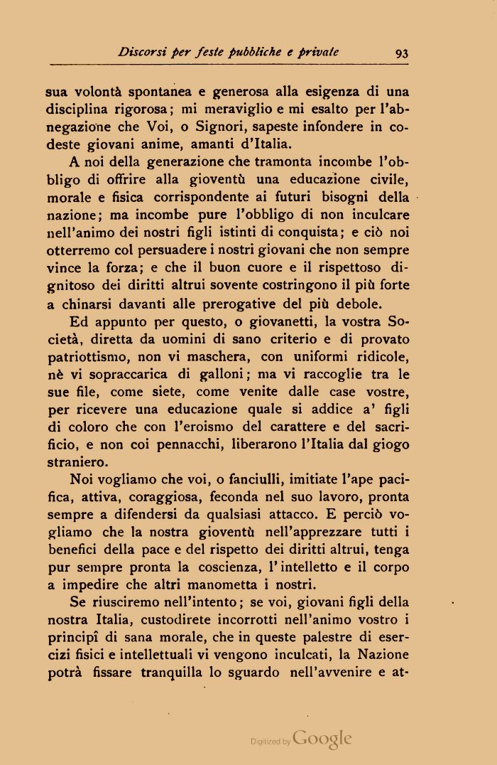 Ed appunto per questo, o giovanetti, la vostra Società, diretta da uomini di sano criterio e di provato patriottismo, non vi maschera, con uniformi ridicole, nè vi sopraccarica di galloni ; ma vi raccoglie tra le sue file, come siete, come venite dalle case vostre, per ricevere una educazione quale si addice a' figli di coloro che con l'eroismo del carattere e del sacrificio, e non coi pennacchi, liberarono l'Italia dal giogo straniero.
