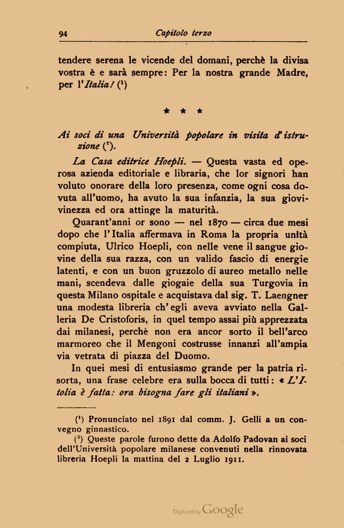 (2) Queste parole furono dette da Adolfo Padovan ai soci dell'Università popolare milanese convenuti nella rinnovata libreria Hoepli la mattina del 2 Luglio 1911,