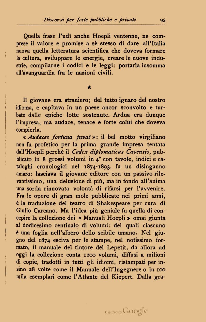 « Audaces fortuna juvat » : il bel motto virgiliano non fu profetico per la prima grande impresa tentata dall'Hoepli perchè il Codex diplomatìeus Cavensis, pubblicato in 8 grossi volumi in 40 con tavole, indici e cataloghi cronologici nel 1874-1893, fu un disinganno amaro: lasciava il giovane editore con un passivo rilevantissimo, una delusione di più, ma in fondo all'anima una sorda rinnovata volontà di rifarsi per l'avvenire. Fra le opere di gran mole pubblicate nei primi anni, è la traduzione del teatro di Shakespeare per cura di Giulio Carcano. Ma l'idea più geniale fu quella di concepire la collezione dei « Manuali Hoepli » ornai giunta al dodicesimo centinaio di volumi : dei quali ciascuno è una foglia nell'albero dello scibile umano. Nel giugno del 1874 esciva per le stampe, nel notissimo formato, il manuale del tintore del Lepetit, da allora ad oggi la collezione conta 1200 volumi, diffusi a milioni di copie, tradotti in tutti gli idiomi, ristampati per in-sino 28 volte come il Manuale dell'Ingegnere o in 100 mila esemplari come l'Atlante del Kiepert. Dalla gra-