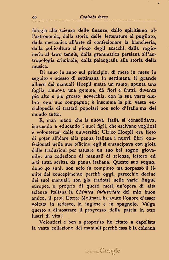 E, man mano che la nuova Italia si consolidava, istruendo e educando i suoi figli, che escivano vogliosi e volonterosi dalle università; Ulrico Hoepli era lieto di poter affidare alla penna italiana i nuovi libri confezionati nelle sue officine, egli si emancipava con gioia dalle traduzioni per attuare un suo bel sogno giovanile: una collezione di manuali di scienze, lettere ed arti tutta scritta da penna italiana. Questo suo sogno, dopo 40 anni, non solo fu compiuto ma sorpassò il limite del concepimento perchè oggi, parecchie decine dei suoi manuali, son già tradotti nelle varie lingue europee, e, proprio di questi mesi, un'opera di alta scienza italiana la Chimica industriale del mio buon amico, il prof. Ettore Molinari, ha avuto l'onore d'esser voltata in tedesco, in inglese e in spagnolo. Valga questo a dimostrare il progresso della patria in otto lustri di vita !
