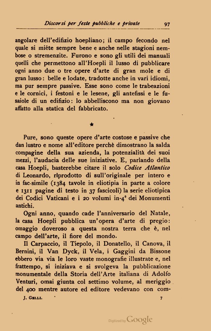 Pure, sono queste opere d'arte costose e passive che dan lustro e nome all'editore perchè dimostrano la salda compagine della sua azienda, la potenzialità dei suoi mezzi, l'audacia delle sue iniziative. E, parlando della casa Hoepli, basterebbe citare il solo Codice Atlantico di Leonardo, riprodotto di sull'originale per intero e in fac-simile (1384 tavole in eliotipia in parte a colore e 1311 pagine di testo in 37 fascicoli) la serie eliotipica dei Codici Vaticani e i 20 volumi in-4° dei Monumenti antichi.