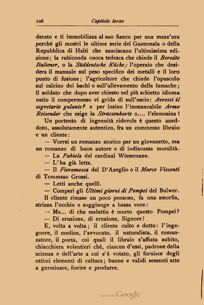 derato e ti immobilizza al suo fianco per una mezz'ora perchè gli mostri le ultime serie del Guatemala o della Repubblica di Haiti che sanciscano l'ultimissima edizione; la rubiconda cuoca tedesca che chiede il Beredte Italiener, o la Siiddeutsche Kiiche; l'operaio che desidera il manuale sul peso specifico dei metalli e il loro punto di fusione ; l'agricoltore che chiede l'opuscolo sul calcino dei bachi o sull'allevamento delle lumache ; il soldato che dopo aver chiesto nel più schietto idioma natio il compermesso vi grida di sull'uscio: Avressi il segretario galante? e per insino l'immancabile Arme Reisender che esige la Strassenkarte o.... l'elemosina !
