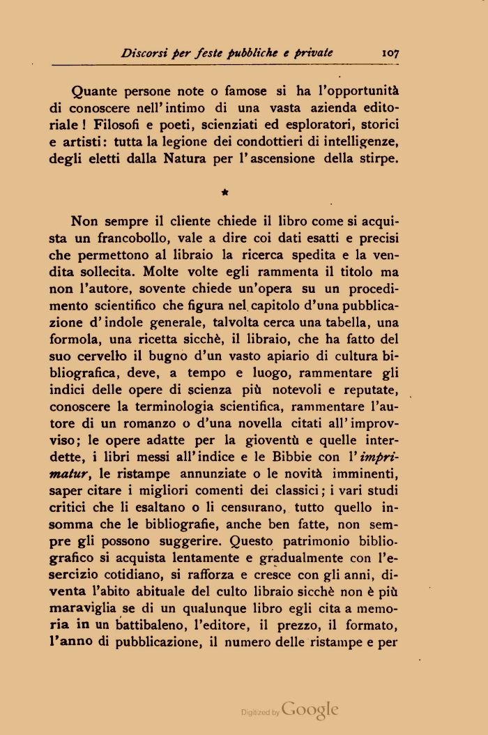 Non sempre il cliente chiede il libro come si acquista un francobollo, vale a dire coi dati esatti e precisi che permettono al libraio la ricerca spedita e la vendita sollecita. Molte volte egli rammenta il titolo ma non l'autore, sovente chiede un'opera su un procedimento scientifico che figura nel capitolo d'una pubblicazione d'indole generale, talvolta cerca una tabella, una formola, una ricetta sicché, il libraio, che ha fatto del suo cervello il bugno d'un vasto apiario di cultura bibliografica, deve, a tempo e luogo, rammentare gli indici delle opere di scienza più notevoli e reputate, conoscere la terminologia scientifica, rammentare l'autore di un romanzo o d'una novella citati all'improvviso; le opere adatte per la gioventù e quelle interdette, i libri messi all'indice e le Bibbie con V imprimatur, le ristampe annunziate o le novità imminenti, saper citare i migliori conienti dei classici ; i vari studi critici che li esaltano o li censurano, tutto quello insomma che le bibliografie, anche ben fatte, non sempre gli possono suggerire. Questo patrimonio bibliografico si acquista lentamente e gradualmente con l'esercizio cotidiano, si rafforza e cresce con gli anni, diventa l'abito abituale del culto libraio sicché non è più maraviglia se di un qualunque libro egli cita a memoria in un battibaleno, l'editore, il prezzo, il formato, l'anno di pubblicazione, il numero delle ristampe e per