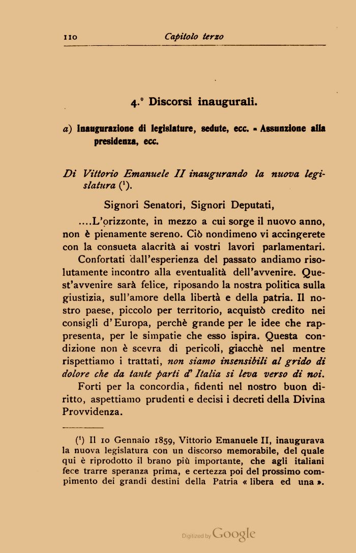 ....L'orizzonte, in mezzo a cui sorge il nuovo anno, non è pienamente sereno. Ciò nondimeno vi accingerete con la consueta alacrità ai vostri lavori parlamentari.