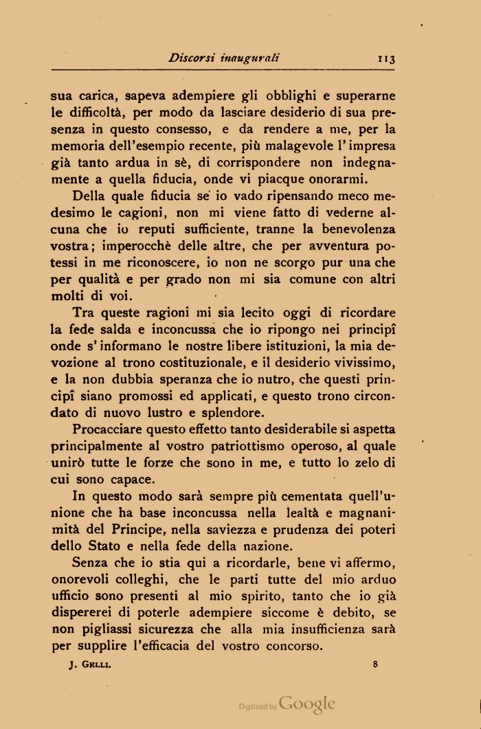 Tra queste ragioni mi sia lecito oggi di ricordare la fede salda e inconcussa che io ripongo nei principi onde s'informano le nostre libere istituzioni, la mia devozione al trono costituzionale, e il desiderio vivissimo, e la non dubbia speranza che io nutro, che questi principi siano promossi ed applicati, e questo trono circondato di nuovo lustro e splendore.