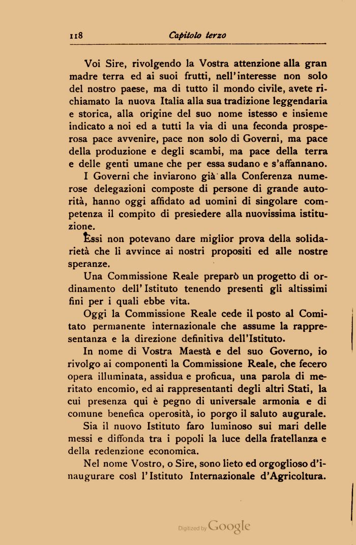 Nel nome Vostro, o Sire, sono lieto ed orgoglioso d'inaugurare cosi l'Istituto Internazionale d'Agricoltura.