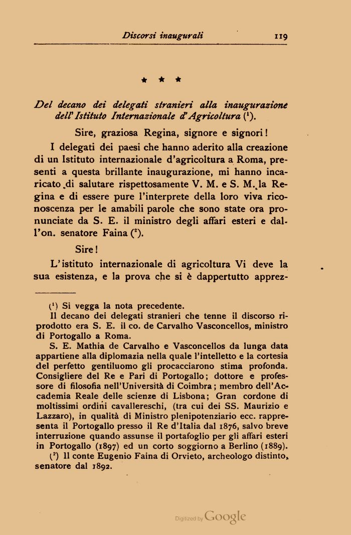 Del decano dei delegati stranieri alla inaugurazione dell' Istituto Internazionale d'Agricoltura (').