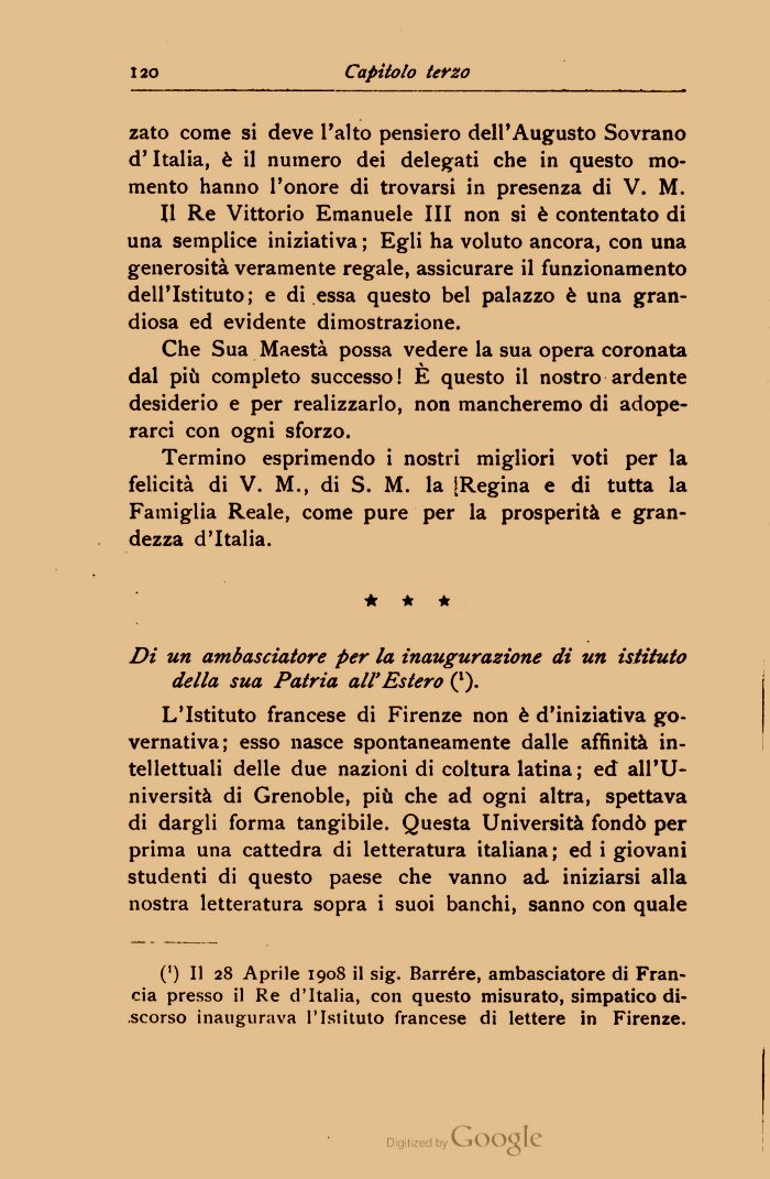 (') Il 28 Aprile 1908 il sig. Barrére, ambasciatore di Francia presso il Re d'Italia, con questo misurato, simpatico discorso inaugurava l'Istituto francese di lettere in Firenze.