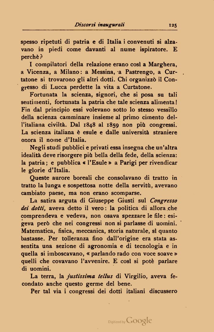 Fortunata la scienza, signori, che si posa su tali sentimenti, fortunata la patria che tale scienza alimenta! Fin dal principio essi volevano sotto lo stesso vessillo della scienza camminare insieme al primo cimento dell'italiana civiltà. Dal 1848 al 1859 non più congressi. La scienza italiana è esule e dalle università straniere onora il nome d'Italia.