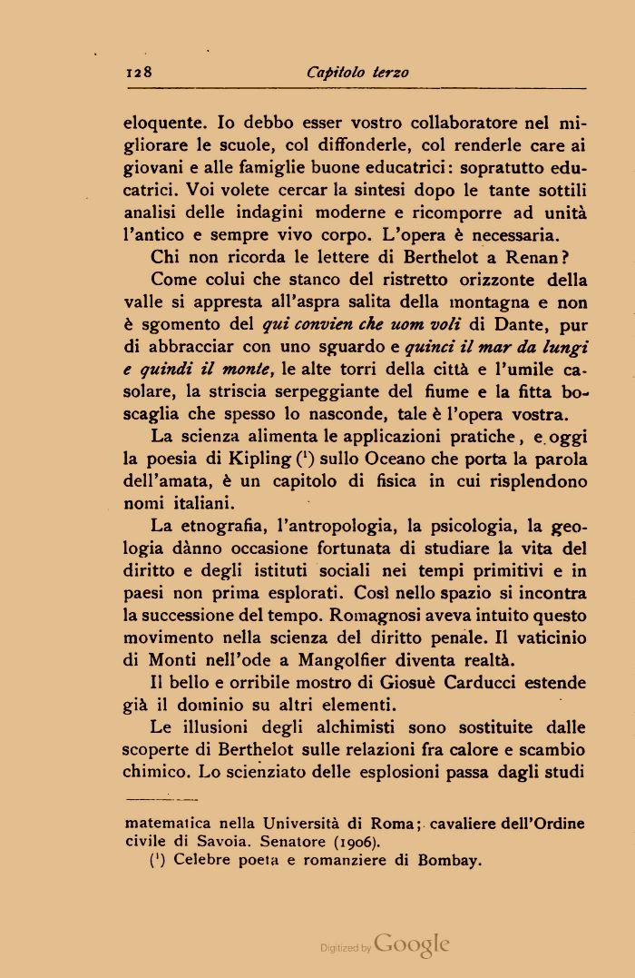 eloquente. Io debbo esser vostro collaboratore nel migliorare le scuole, col diffonderle, col renderle care ai giovani e alle famiglie buone educatrici: sopratutto educatrici. Voi volete cercar la sintesi dopo le tante sottili analisi delle indagini moderne e ricomporre ad unitā l'antico e sempre vivo corpo. L'opera č necessaria.