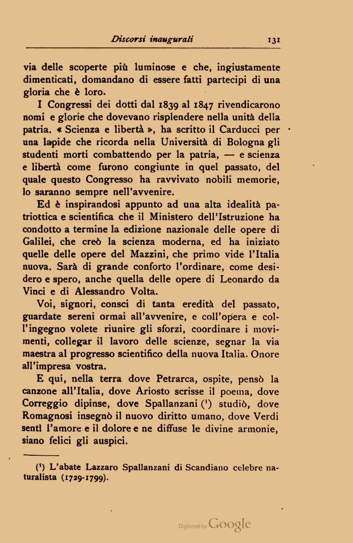 Voi, signori, consci di tanta eredità del passato, guardate sereni ormai all'avvenire, e coll'opera e col-l'ingegno volete riunire gli sforzi, coordinare i movimenti, collegar il lavoro delle scienze, segnar la via maestra al progresso scientifico della nuova Italia. Onore all'impresa vostra.