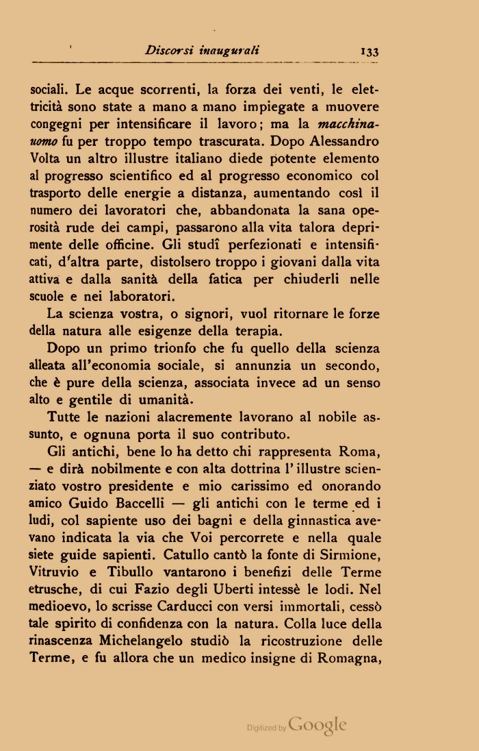 Gli antichi, bene lo ha detto chi rappresenta Roma, — e dirà nobilmente e con alta dottrina l'illustre scienziato vostro presidente e mio carissimo ed onorando amico Guido Baccelli — gli antichi con le terme ed i ludi, col sapiente uso dei bagni e della ginnastica avevano indicata la via che Voi percorrete e nella quale siete guide sapienti. Catullo cantò la fonte di Sirmione, Vitruvio e Tibullo vantarono i benefizi delle Terme etrusche, di cui Fazio degli Uberti intessè le lodi. Nel medioevo, lo scrisse Carducci con versi immortali, cessò tale spirito di confidenza con la natura. Colla luce della rinascenza Michelangelo studiò la ricostruzione delle Terme, e fu allora che un medico insigne di Romagna,