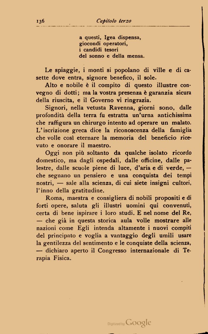 Oggi non più soltanto da qualche isolato ricordo domestico, ma dagli ospedali, dalle officine, dalle palestre, dalle scuole piene di luce, d'aria e di verde, — che segnano un pensiero e una conquista dei tempi nostri, — sale alla scienza, di cui siete insigni cultori, l'inno della gratitudine.