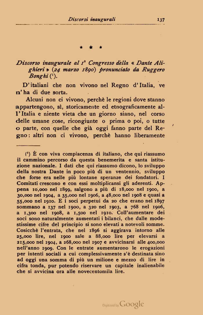 Discorso inaugurale al 10 Congresso d'ella « Dante Alighieri » {24 marzo 1890) pronunciato da Ruggero Bonghi (').