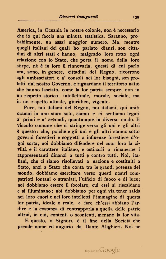 Pure, noi italiani del Regno, noi italiani, qui uniti oramai in uno stato solo, siamo e ci sentiamo legati a' primi e a' secondi, quantunque in diverso modo. Il vincolo comune che ci stringe verso gli uni e gli altri è questo : che, poiché e gli uni e gli altri stanno sotto governi forestieri e soggetti a influenze forestiere d'ogni sorta, noi dobbiamo difendere nel cuor loro la civiltà e il carattere italiano, e ostinarli a rimanerne i rappresentanti dinanzi a tutti e contro tutti. Noi, italiani, che ci siamo risollevati a nazione e costituiti a Stato, anzi a Stato che conta tra le grandi potenze del mondo, dobbiamo esercitare verso questi nostri compatrioti lontani o straniati, l'ufficio di fuoco e di luce; noi dobbiamo essere il focolare, cui essi si riscaldano e si illuminano; noi dobbiamo per ogni via tener salda nei loro cuori e nei loro intelletti l'immagine di questa lor patria, ideale o reale, e fare ch'essi abbiano l'ardire e la costanza di contrapporla a quella delle patrie altrui, in cui, contenti o scontenti, menano la lor vita.