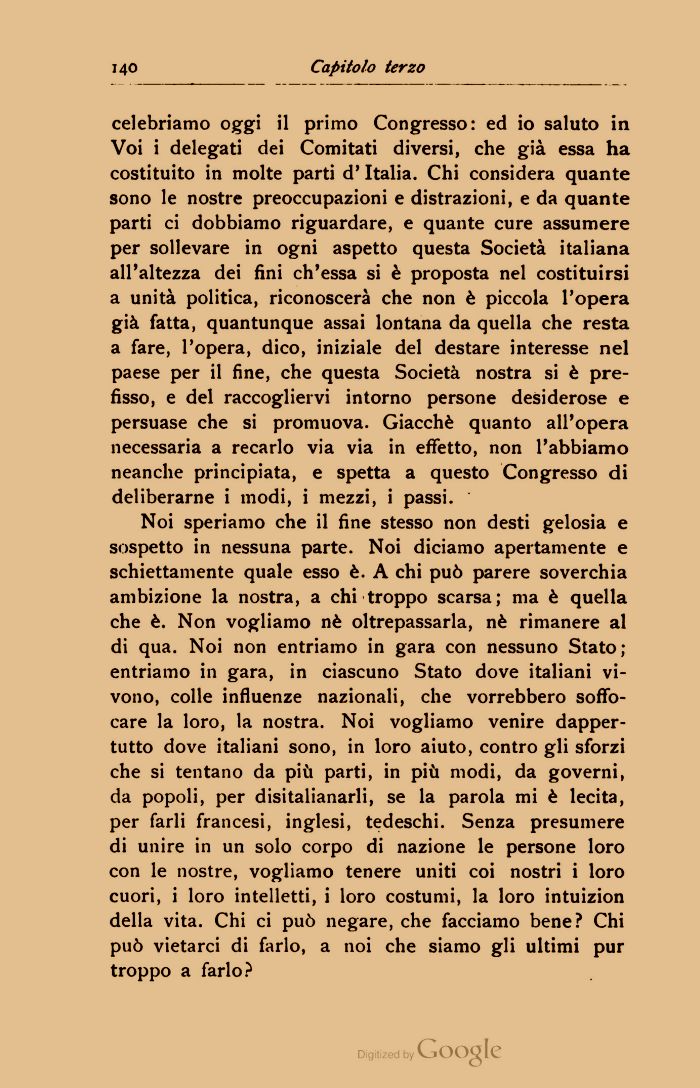 Noi speriamo che il fine stesso non desti gelosia e sospetto in nessuna parte. Noi diciamo apertamente e schiettamente quale esso è. A chi può parere soverchia ambizione la nostra, a chi troppo scarsa; ma è quella che è. Non vogliamo nè oltrepassarla, nè rimanere al di qua. Noi non entriamo in gara con nessuno Stato ; entriamo in gara, in ciascuno Stato dove italiani vivono, colle influenze nazionali, che vorrebbero soffocare la loro, la nostra. Noi vogliamo venire dappertutto dove italiani sono, in loro aiuto, contro gli sforzi che si tentano da più parti, in più modi, da governi, da popoli, per disitalianarli, se la parola mi è lecita, per farli francesi, inglesi, tedeschi. Senza presumere di unire in un solo corpo di nazione le persone loro con le nostre, vogliamo tenere uniti coi nostri i loro cuori, i loro intelletti, i loro costumi, la loro intuizion della vita. Chi ci può negare, che facciamo bene? Chi può vietarci di farlo, a noi che siamo gli ultimi pur troppo a farlo?