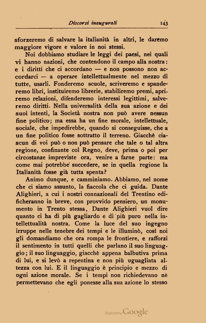 Animo dunque, e camminiamo. Abbiamo, nel nome che ci siamo assunto, la fiaccola che ci guida. Dante Alighieri, a cui i nostri connazionali del Trentino edificheranno in breve, con provvido pensiero, un monumento in Trento stessa, Dante Alighieri vuol dire quanto ci ha di più gagliardo e di più puro nella intellettualità nostra. Come la luce del suo ingegno irruppe nelle tenebre dei tempi e le illuminò, così noi gli domandiamo che ora rompa le frontiere, e rafforzi il sentimento in tutti quelli che parlano il suo linguaggio ; il suo linguaggio, giacché appena balbutiva prima di lui, e si levò a repentina e non più uguagliata altezza con lui. E il linguaggio è principio e mezzo di ogni azione morale. Se i tempi non richiedevano nè permettevano che egli ponesse alla sua azione lo stesso