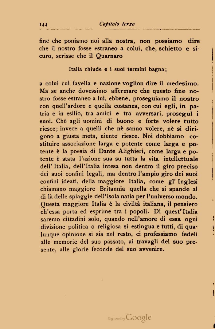 a colui cui favella e nazione voglion dire il medesimo. Ma se anche dovessimo affermare che questo fine nostro fosse estraneo a lui, ebbene, proseguiamo il nostro con quell'ardore e quella costanza, con cui egli, in patria e in esilio, tra amici e tra avversari, proseguì i suoi. Chè agli uomini di buono e forte volere tutto riesce; invece a quelli che nè sanno volere, nè si dirigono a giusta meta, niente riesce. Noi dobbiamo costituire associazione larga e potente come larga e potente è la poesia di Dante Alighieri, come larga e potente è stata l'azione sua su tutta la vita intellettuale dell' Italia, dell'Italia intesa non dentro il giro preciso dei suoi confini legali, ma dentro l'ampio giro dei suoi confini ideati, della maggiore Italia, come gì' Inglesi chiamano maggiore Britannia quella che si spande al di là delle spiaggie dell'isola natia per l'universo mondo. Questa maggiore Italia è la civiltà italiana, il pensiero ch'essa porta ed esprime tra i popoli. Di quest'Italia saremo cittadini solo, quando nell'amore di essa ogni divisione politica o religiosa si estingua e tutti, di qualunque opinione si sia nel resto, ci professiamo fedeli alle memorie del suo passato, ai travagli del suo presente, alle glorie feconde del suo avvenire.
