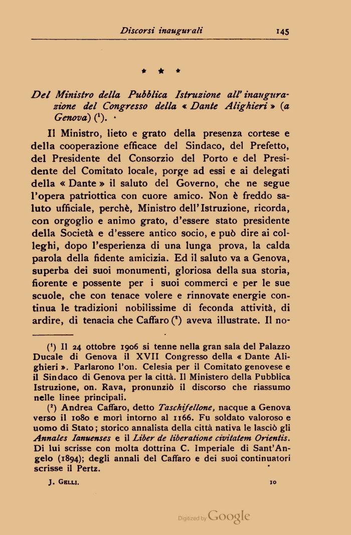 (') Il 24 ottobre 1906 si tenne nella gran sala del Palazzo Ducale di Genova il XVII Congresso della « Dante Alighieri ». Parlarono l'oli. Celesia per il Comitato genovese e il Sindaco di Genova per la città. Il Ministero della Pubblica Istruzione, on. Rava, pronunziò il discorso che riassumo nelle linee principali.
