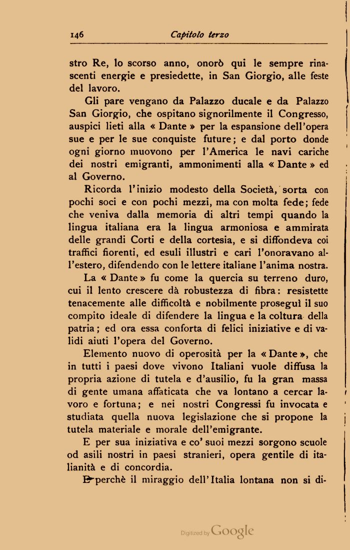 Elemento nuovo di operosità per la « Dante », che in tutti i paesi dove vivono Italiani vuole diffusa la propria azione di tutela e d'ausilio, fu la gran massa di gente umana affaticata che va lontano a cercar lavoro e fortuna; e nei nostri Congressi fu invocata e studiata quella nuova legislazione che si propone la tutela materiale e morale dell'emigrante.