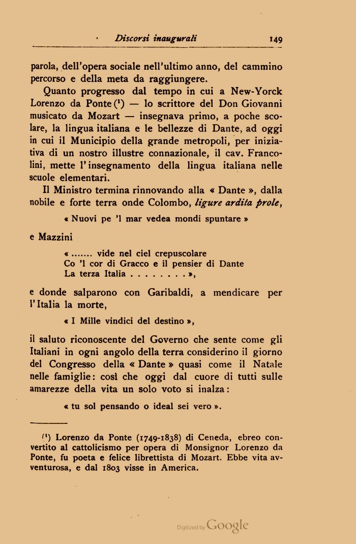 Quanto progresso dal tempo in cui a New-Yorck Lorenzo da Ponte (') — lo scrittore del Don Giovanni musicato da Mozart — insegnava primo, a poche scolare, la lingua italiana e le bellezze di Dante, ad oggi in cui il Municipio della grande metropoli, per iniziativa di un nostro illustre connazionale, il cav. Francolini, mette l'insegnamento della lingua italiana nelle scuole elementari.