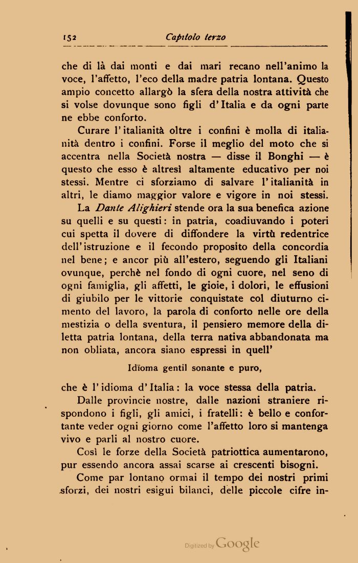 La Dante Alighieri stende ora la sua benefica azione su quelli e su questi : in patria, coadiuvando i poteri cui spetta il dovere di diffondere la virtù redentrice dell'istruzione e il fecondo proposito della concordia nel bene; e ancor più all'estero, seguendo gli Italiani ovunque, perchè nel fondo di ogni cuore, nel seno di ogni famiglia, gli affetti, le gioie, i dolori, le effusioni di giubilo per le vittorie conquistate col diuturno cimento del lavoro, la parola di conforto nelle ore della mestizia o della sventura, il pensiero memore della diletta patria lontana, della terra nativa abbandonata ma non obliata, ancora siano espressi in quell'