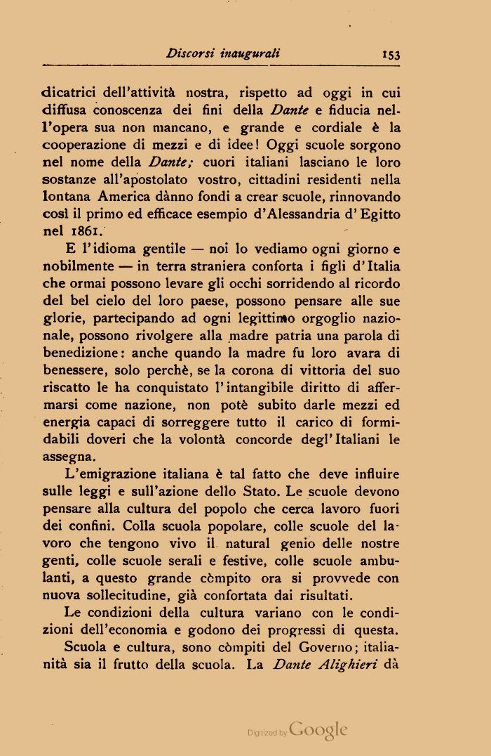E l'idioma gentile — noi lo vediamo ogni giorno e nobilmente — in terra straniera conforta i figli d'Italia che ormai possono levare gli occhi sorridendo al ricordo del bel cielo del loro paese, possono pensare alle sue glorie, partecipando ad ogni legittimo orgoglio nazionale, possono rivolgere alla madre patria una parola di benedizione : anche quando la madre fu loro avara di benessere, solo perchè, se la corona di vittoria del suo riscatto le ha conquistato l'intangibile diritto di affermarsi come nazione, non potè subito darle mezzi ed energia capaci di sorreggere tutto il carico di formidabili doveri che la volontà concorde degl'Italiani le assegna.