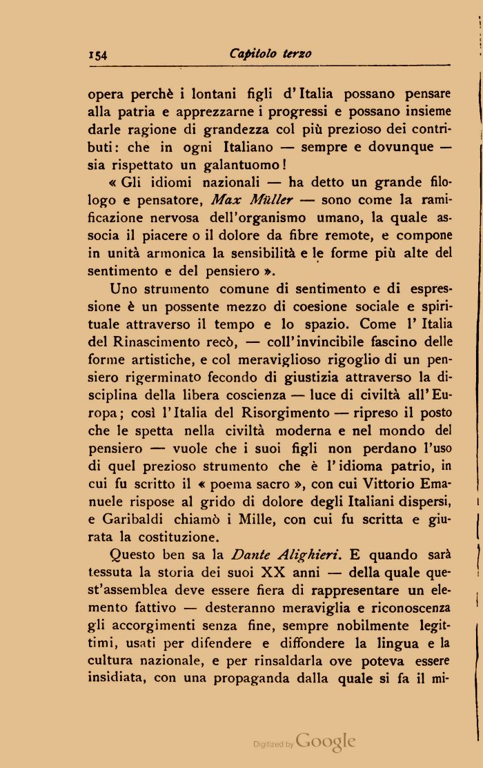 Uno strumento comune di sentimento e di espressione è un possente mezzo di coesione sociale e spirituale attraverso il tempo e lo spazio. Come 1' Italia del Rinascimento recò, — coli'invincibile fascino delle forme artistiche, e col meraviglioso rigoglio di un pensiero rigerminato fecondo di giustizia attraverso la disciplina della libera coscienza — luce di civiltà all'Europa; cosi l'Italia del Risorgimento — ripreso il posto che le spetta nella civiltà moderna e nel mondo del pensiero — vuole che i suoi figli non perdano l'uso di quel prezioso strumento che è l'idioma patrio, in cui fu scritto il « poema sacro », con cui Vittorio Emanuele rispose al grido di dolore degli Italiani dispersi, e Garibaldi chiamò i Mille, con cui fu scritta e giurata la costituzione.