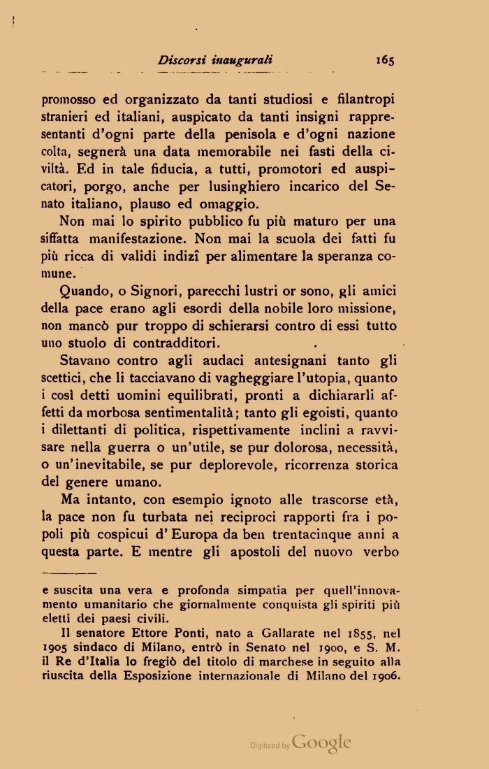 Quando, o Signori, parecchi lustri or sono, gli amici della pace erano agli esordi della nobile loro missione, non mancò pur troppo di schierarsi contro di essi tutto uno stuolo di contradditori.