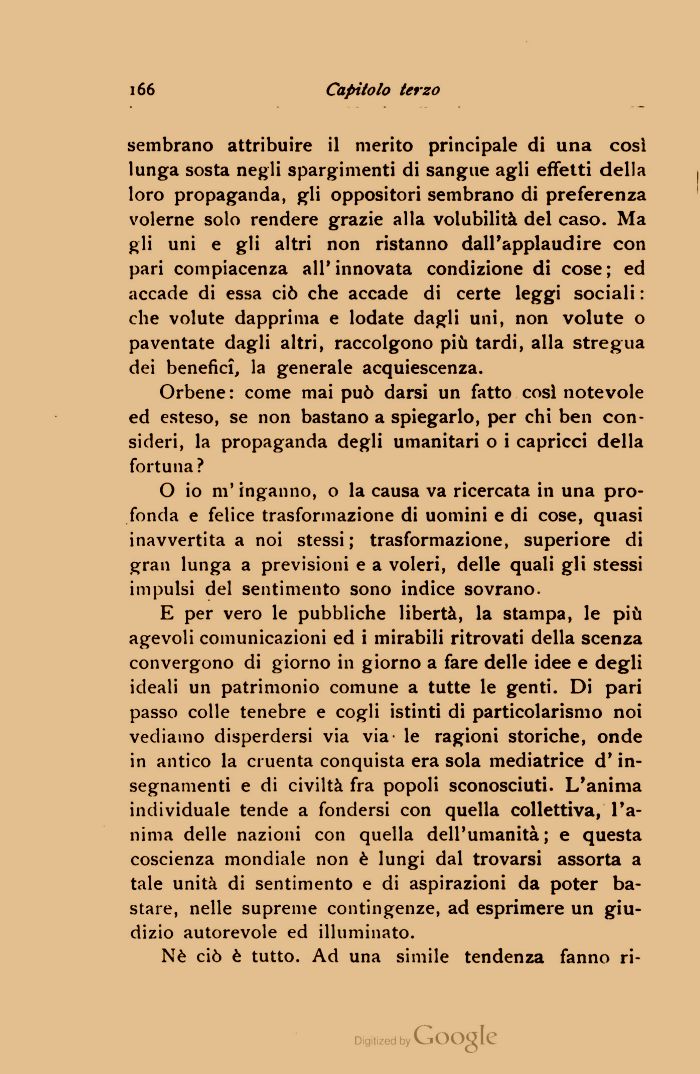 E per vero le pubbliche libertà, la stampa, le più agevoli comunicazioni ed i mirabili ritrovati della scenza convergono di giorno in giorno a fare delle idee e degli ideali un patrimonio comune a tutte le genti. Di pari passo colle tenebre e cogli istinti di particolarismo noi vediamo disperdersi via via- le ragioni storiche, onde in antico la cruenta conquista era sola mediatrice d'insegnamenti e di civiltà fra popoli sconosciuti. L'anima individuale tende a fondersi con quella collettiva, l'anima delle nazioni con quella dell'umanità; e questa coscienza mondiale non è lungi dal trovarsi assorta a tale unità di sentimento e di aspirazioni da poter bastare, nelle supreme contingenze, ad esprimere un giudizio autorevole ed illuminato.