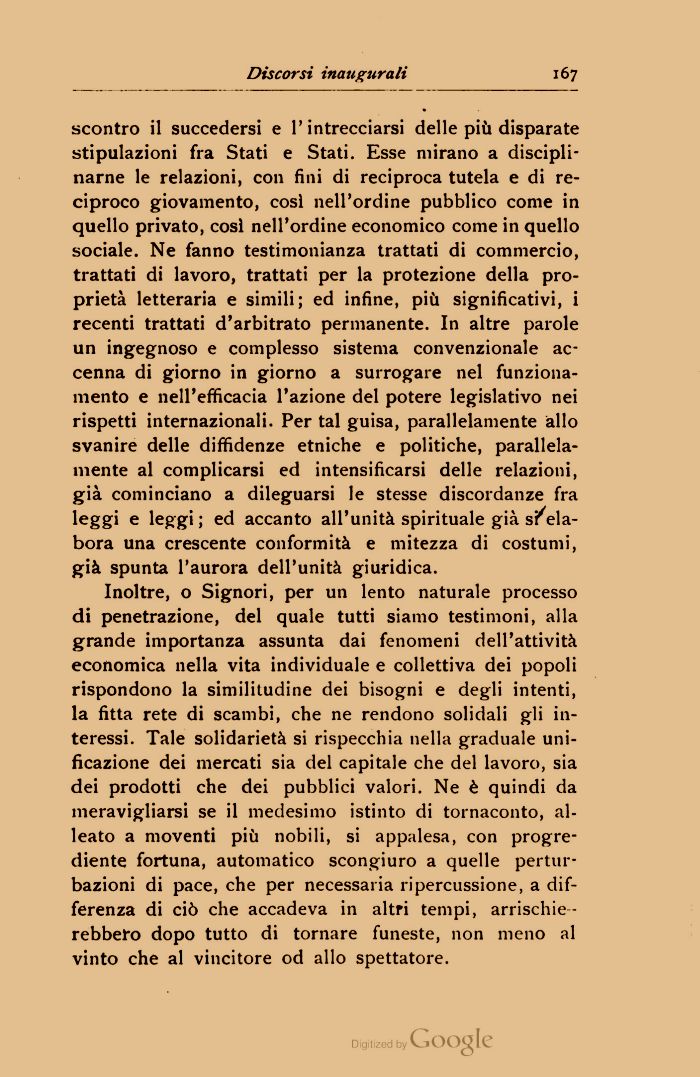 Inoltre, o Signori, per un lento naturale processo di penetrazione, del quale tutti siamo testimoni, alla grande importanza assunta dai fenomeni dell'attività economica nella vita individuale e collettiva dei popoli rispondono la similitudine dei bisogni e degli intenti, la fitta rete di scambi, che ne rendono solidali gli interessi. Tale solidarietà si rispecchia nella graduale unificazione dei mercati sia del capitale che del lavoro, sia dei prodotti che dei pubblici valori. Ne è quindi da meravigliarsi se il medesimo istinto di tornaconto, alleato a moventi più nobili, si appalesa, con progrediente fortuna, automatico scongiuro a quelle perturbazioni di pace, che per necessaria ripercussione, a differenza di ciò che accadeva in altri tempi, arrischie-rebbero dopo tutto di tornare funeste, non meno al vinto che al vincitore od allo spettatore.