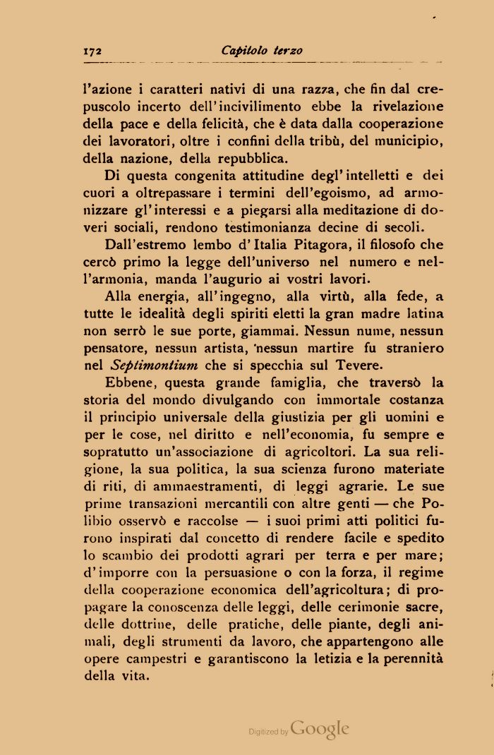 Ebbene, questa grande famiglia, che traversò la storia del mondo divulgando con immortale costanza il principio universale della giustizia per gli uomini e per le cose, nel diritto e nell'economia, fu sempre e sopratutto un'associazione di agricoltori. La sua religione, la sua politica, la sua scienza furono materiate di riti, di ammaestramenti, di leggi agrarie. Le sue prime transazioni mercantili con altre genti — che Polibio osservò e raccolse — i suoi primi atti politici furono inspirati dal concetto di rendere facile e spedito lo scambio dei prodotti agrari per terra e per mare; d'imporre con la persuasione o con la forza, il regime della cooperazione economica dell'agricoltura; di propagare la conoscenza delle leggi, delle cerimonie sacre, delle dottrine, delle pratiche, delle piante, degli animali, degli strumenti da lavoro, che appartengono alle opere campestri e garantiscono la letizia e la perennità della vita.
