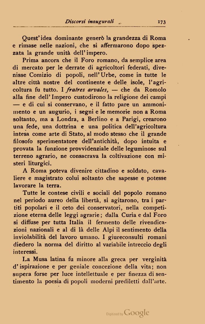 Prima ancora che il Foro romano, da semplice area di mercato per le derrate di agricoltori federati, divenisse Comizio di popoli, nell'Urbe, come in tutte le altre città nostre del continente e delle isole, l'agricoltura fu tutto. I fratres arvales, — che da Romolo alla fine dell'Impero custodirono la religione dei campi — e di cui si conservano, e il fatto pare un ammonimento e un augurio, i segni e le memorie non a Roma soltanto, ma a Londra, a Berlino e a Parigi, crearono una fede, una dottrina e una politica dell'agricoltura intesa come arte di Stato, al modo stesso che il grande filosofo sperimentatore dell'antichità, dopo intuita e provata la funzione provvidenziale delle leguminose sul terreno agrario, ne consacrava la coltivazione con misteri liturgici.