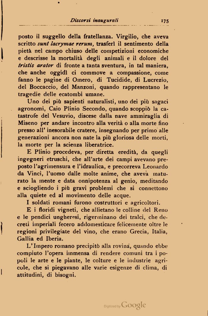 Uno dei più sapienti naturalisti, uno dei più sagaci agronomi, Caio Plinio Secondo, quando scoppiò la catastrofe del Vesuvio, discese dalla nave ammiraglia di Miseno per andare incontro alla verità o alla morte fino presso all' inesorabile cratere, insegnando per primo alle generazioni ancora non nate la più gloriosa delle morti, la morte per la scienza liberatrice.