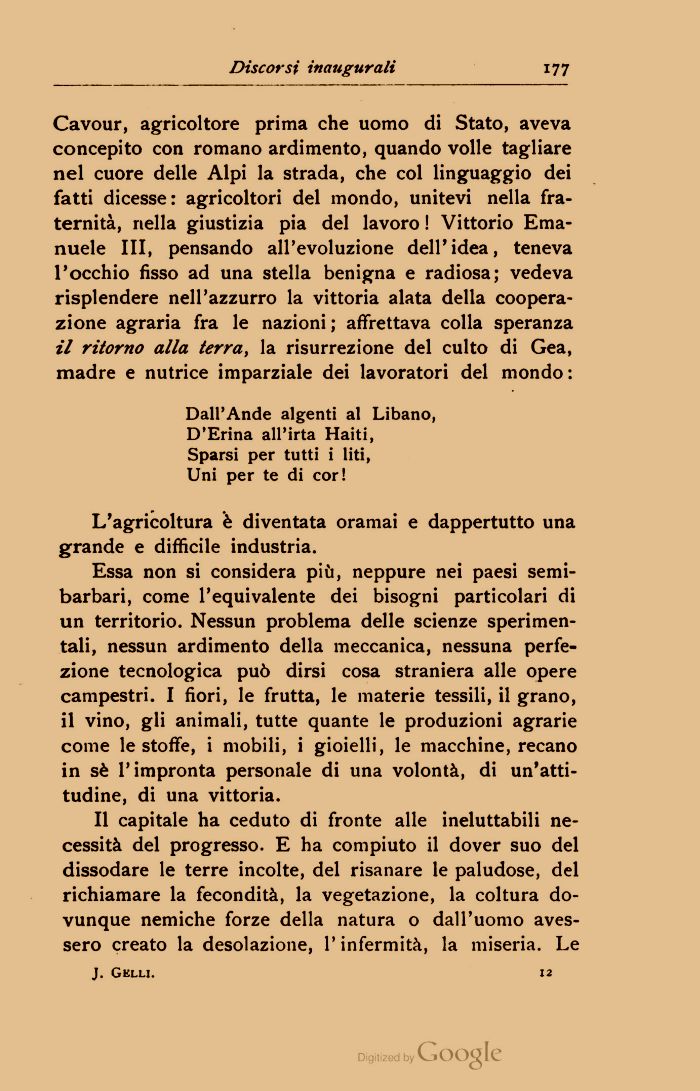 Cavour, agricoltore prima che uomo di Stato, aveva concepito con romano ardimento, quando volle tagliare nel cuore delle Alpi la strada, che col linguaggio dei fatti dicesse : agricoltori del mondo, unitevi nella fraternità, nella giustizia pia del lavoro ! Vittorio Emanuele III, pensando all'evoluzione dell'idea, teneva l'occhio fisso ad una stella benigna e radiosa; vedeva risplendere nell'azzurro la vittoria alata della cooperazione agraria fra le nazioni ; affrettava colla speranza il ritorno alla terra, la risurrezione del culto di Gea, madre e nutrice imparziale dei lavoratori del mondo :
