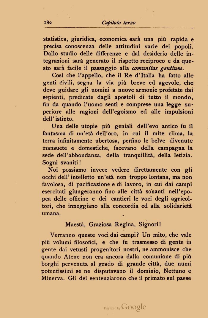 Cosi che l'appello, che il Re d'Italia ha fatto alle genti civili, segna la via più breve ed agevole, che deve guidare gli uomini a nuove armonie profetate dai sepienti, predicate dagli apostoli di tutto il mondo, fin da quando l'uomo sentì e comprese una legge superiore alle ragioni dell'egoismo ed alle impulsioni dell' istinto.