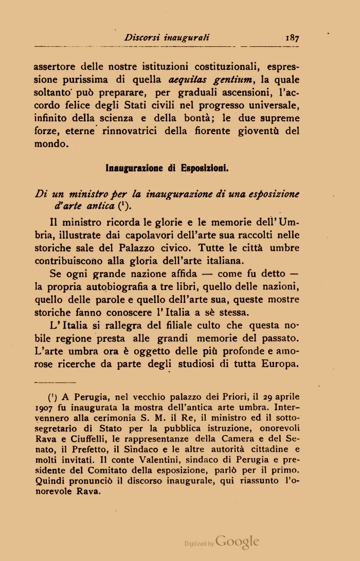 (') A Perugia, nel vecchio palazzo dei Priori, il 29 aprile 1907 fu inaugurata la mostra dell'antica arte umbra. Intervennero alla cerimonia S. M. il Re, il ministro ed il sottosegretario di Stato per la pubblica istruzione, onorevoli Rava e Ciuffelli, le rappresentanze della Camera e del Senato, il Prefetto, il Sindaco e le altre autorità cittadine e molti invitati. Il conte Valentini, sindaco di Perugia e presidente del Comitato della esposizione, parlò per il primo. Quindi pronunciò il discorso inaugurale, qui riassunto l'onorevole Rava.