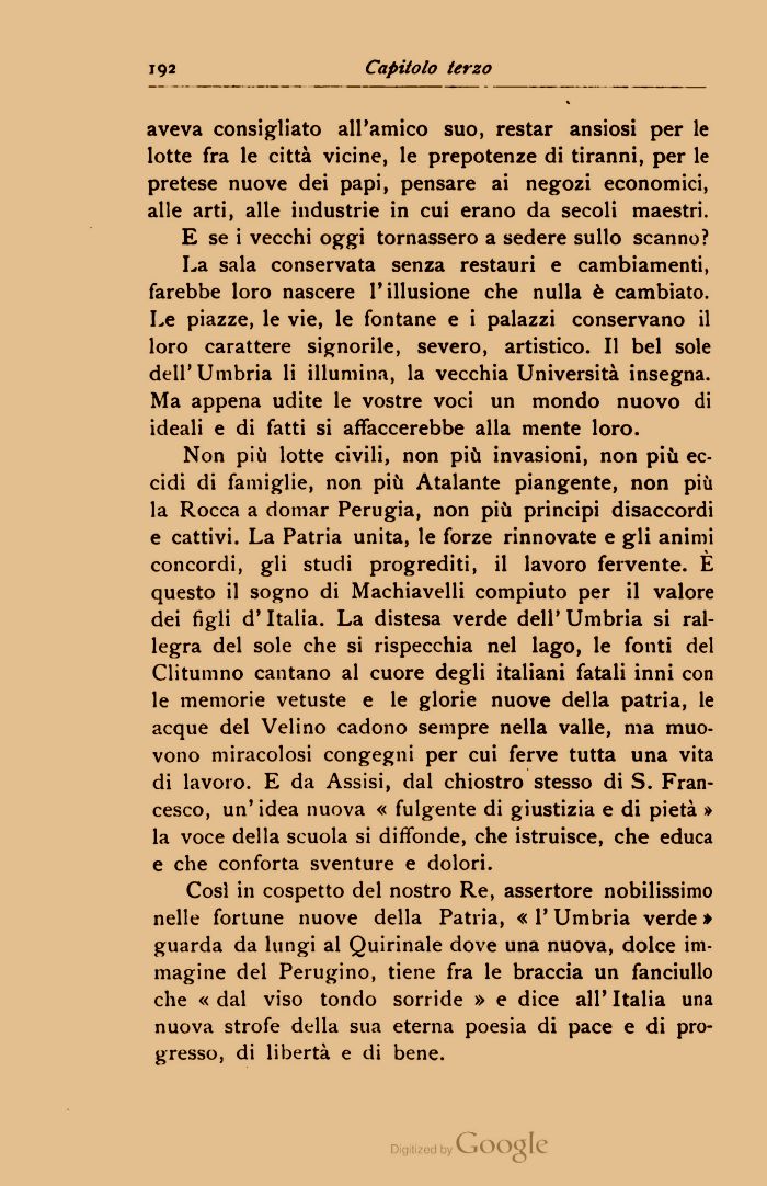 Non più lotte civili, non più invasioni, non più eccidi di famiglie, non più Atalante piangente, non più la Rocca a domar Perugia, non più principi disaccordi e cattivi. La Patria unita, le forze rinnovate e gli animi concordi, gli studi progrediti, il lavoro fervente. E questo il sogno di Machiavelli compiuto per il valore dei figli d'Italia. La distesa verde dell' Umbria si rallegra del sole che si rispecchia nel lago, le fonti del Clitumno cantano al cuore degli italiani fatali inni con le memorie vetuste e le glorie nuove della patria, le acque del Velino cadono sempre nella valle, ma muovono miracolosi congegni per cui ferve tutta una vita di lavoro. E da Assisi, dal chiostro stesso di S. Francesco, un' idea nuova « fulgente di giustizia e di pietà » la voce della scuola si diffonde, che istruisce, che educa e che conforta sventure e dolori.