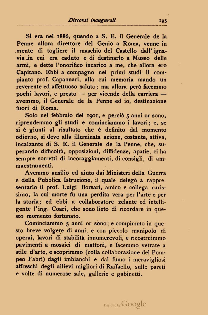 Avemmo ausilio ed aiuto dai Ministeri della Guerra e della Pubblica Istruzione, il quale delegò a rappresentarlo il prof. Luigi Borsari, amico e collega carissimo, la cui morte fu una perdita vera per l'arte e per la storia; ed ebbi a collaboratore zelante ed intelligente l'ing. Coari, che sono lieto di ricordare in questo momento fortunato.