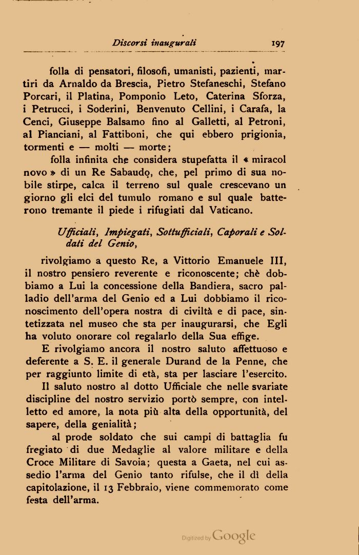 rivolgiamo a questo Re, a Vittorio Emanuele III, il nostro pensiero reverente e riconoscente; chè dobbiamo a Lui la concessione della Bandiera, sacro palladio dell'arma del Genio ed a Lui dobbiamo il riconoscimento dell'opera nostra di civiltà e di pace, sintetizzata nel museo che sta per inaugurarsi, che Egli ha voluto onorare col regalarlo della Sua effige.