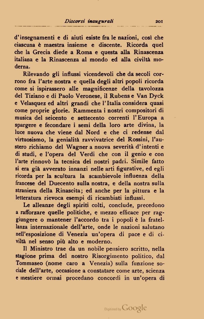 Le alleanze degli spiriti colti, conclude, precedono a rafforzare quelle politiche, e mezzo efficace per raggiungere o mantener l'accordo tra i popoli è la fratellanza internazionale dell'arte, onde le nazioni salutano nell'esposizione di Venezia un'opera di pace e di civiltà nel senso più alto e moderno.