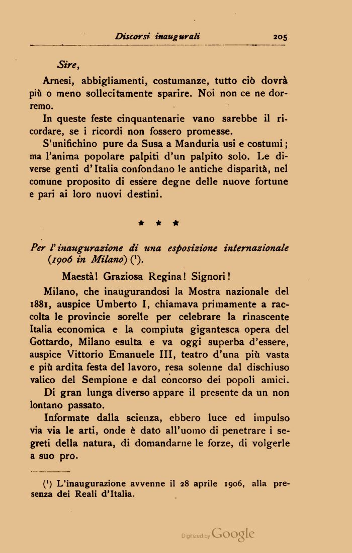 Milano, che inaugurandosi la Mostra nazionale del 1881, auspice Umberto I, chiamava primamente a raccolta le provincie sorelle per celebrare la rinascente Italia economica e la compiuta gigantesca opera del Gottardo, Milano esulta e va oggi superba d'essere, auspice Vittorio Emanuele III, teatro d'una più vasta e più ardita festa del lavoro, resa solenne dal dischiuso valico del Sempione e dal concorso dei popoli amici.