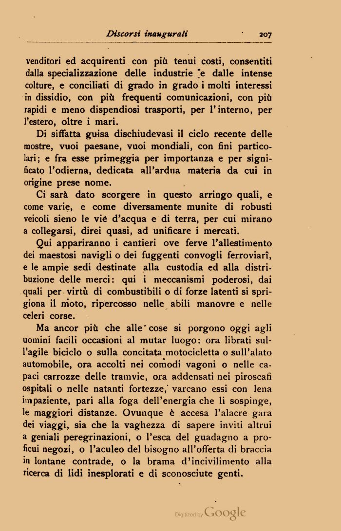 Ma ancor più che alle'cose si porgono oggi agli uomini facili occasioni al mutar luogo: ora librati sull'agile biciclo o sulla concitata motocicletta o sull'alato automobile, ora accolti nei comodi vagoni o nelle capaci carrozze delle tramvie, ora addensati nei piroscafi ospitali o nelle natanti fortezze,' varcano essi con lena impaziente, pari alla foga dell'energia che li sospinge, le maggiori distanze. Ovunque è accesa l'alacre gara dei viaggi, sia che la vaghezza di sapere inviti altrui a geniali peregrinazioni, o l'esca del guadagno a proficui negozi, o l'aculeo del bisogno all'offerta di braccia in lontane contrade, o la brama d'incivilimento alla ricerca di lidi inesplorati e di sconosciute genti.