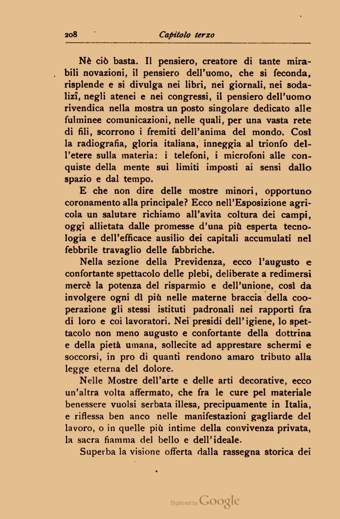 Nè ciò basta. Il pensiero, creatore di tante mirabili novazioni, il pensiero dell'uomo, che si feconda, risplende e si divulga nei libri, nei giornali, nei sodalizi, negli atenei e nei congressi, il pensiero dell'uomo rivendica nella mostra un posto singolare dedicato alle fulminee comunicazioni, nelle quali, per una vasta rete di fili, scorrono i fremiti dell'anima del mondo. Così la radiografia, gloria italiana, inneggia al trionfo dell'etere sulla materia: i telefoni, i microfoni alle conquiste della mente sui limiti imposti ai sensi dallo spazio e dal tempo.