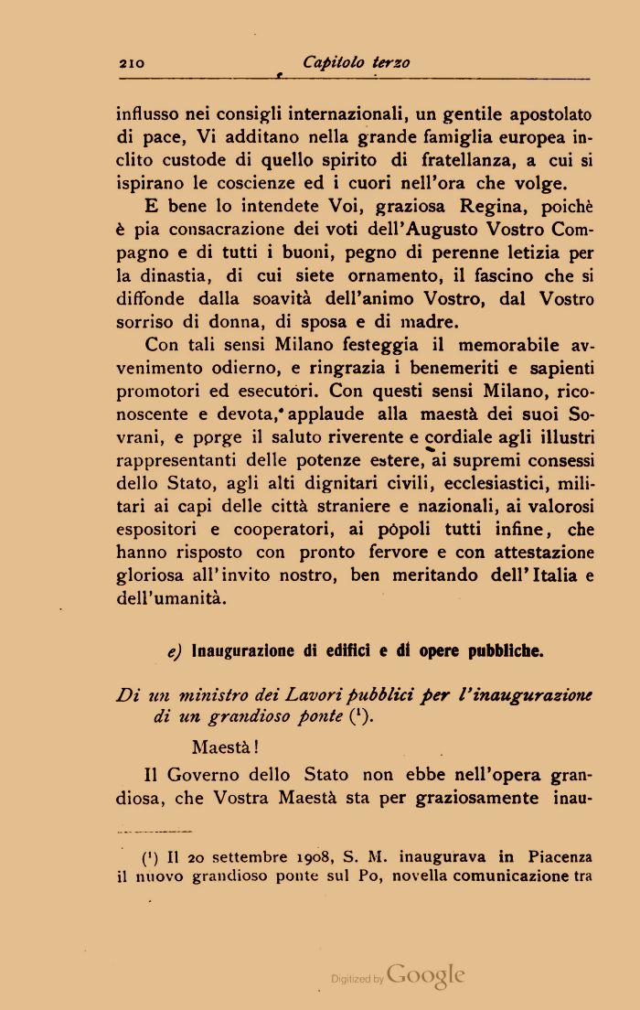 E bene lo intendete Voi, graziosa Regina, poiché è pia consacrazione dei voti dell'Augusto Vostro Compagno e di tutti i buoni, pegno di perenne letizia per la dinastia, di cui siete ornamento, il fascino che si diffonde dalla soavità dell'animo Vostro, dal Vostro sorriso di donna, di sposa e di madre.